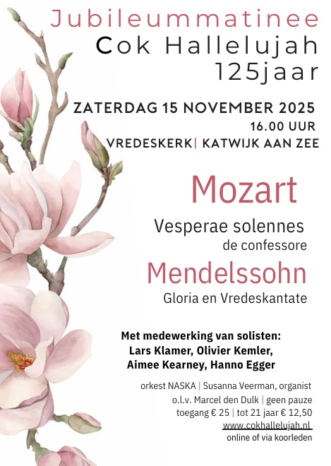 Wij oefenen elke dinsdagavond voor een prachtig jubileum Matinee op zaterdagmiddag 15 november 2025 om 16.00 uur in de Vredeskerk van Katwijk aan Zee. Het programma belooft prachtig te worden, met het Vesperae van Mozart en Gloria van Mendelssohn, waaraan de volgende talentvolle jonge solisten zullen meewerken: Lars Klamer (bas), Olivier Kemler (tenor), Aimee Kearney (sopraan) en de countertenor Hanno Egger, die de altpartij voor zijn rekening zal nemen.